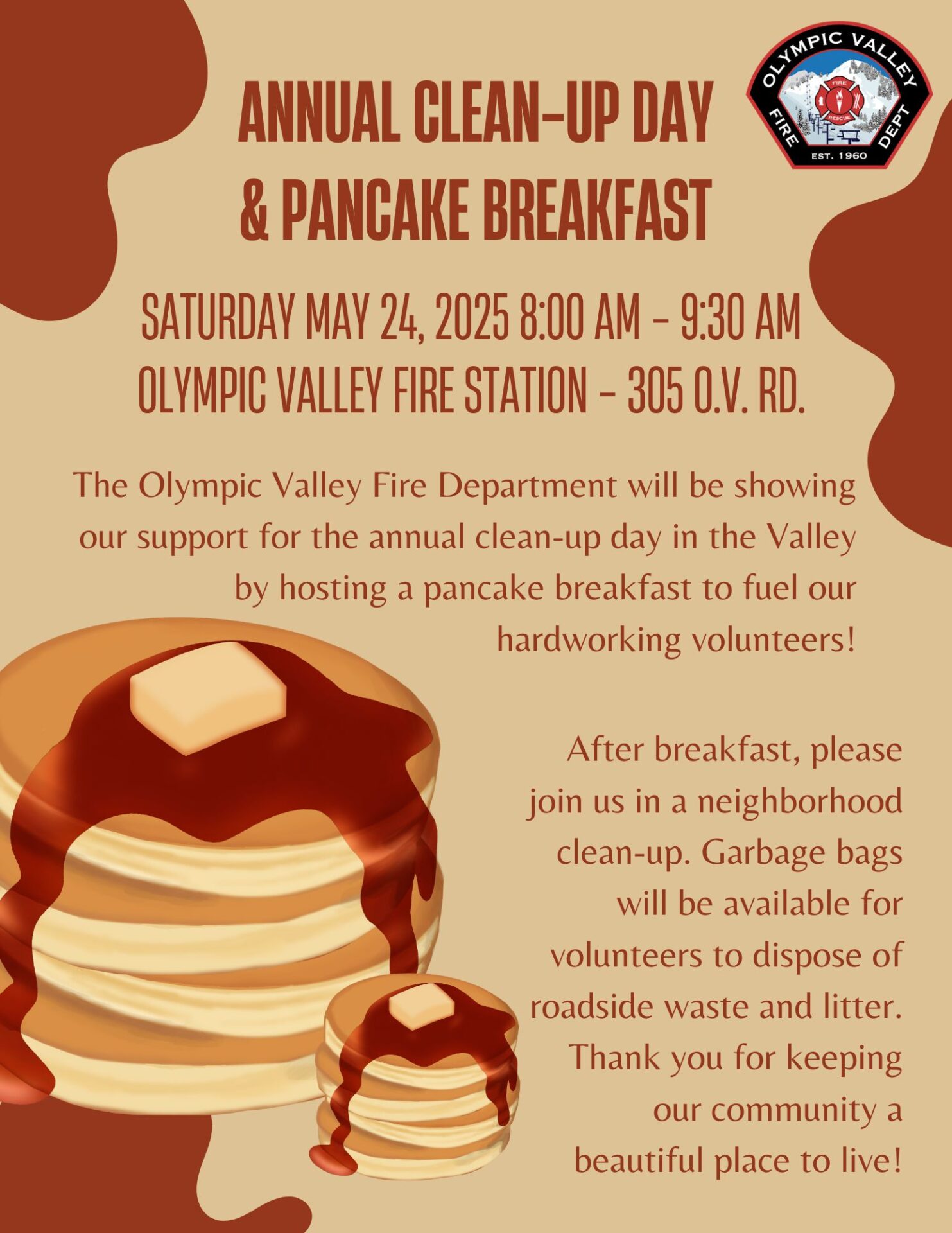 On the Saturday of Memorial Day weekend, the Olympic Valley Fire Department proudly supports the Valley’s annual clean-up day by hosting a delicious pancake breakfast at the Fire Station. After enjoying a hearty meal, community volunteers come together to clean up roadside waste and litter, making our neighborhood shine. Click here for 2025 details!